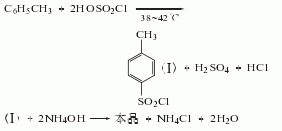 1.由對磺酰氯與氨水反應而得。工藝流程:先向胺化鍋中放入適量的冰水,再將按質量配比(對磺酰氯:純氨=1:0.2)計量好的對磺酰氯和氨水依次放入鍋中,開動攪拌器,利用胺化鍋夾套的冷液控制鍋內溫度至70℃左右(該反應大量放熱),然后降溫至30℃左右出料。胺化物放入過濾桶過濾,并用溫水洗滌,吸干則得固體粉狀粗品對磺酰胺。粗品對磺酰胺含有少量的鄰位體信副產品油狀有色物質。利用對位胺易溶于氫氧化鈉液的性質及用活性炭脫色,可達到提純精制目的。物料質量配比為粗對位胺:30%氫氧化鈉液堿:水=100:45:1300;粗對位胺:活性炭=100:(2.5-3.5)。按此配方量將水和燒堿放入提純鍋中,打開夾套蒸汽閥加熱至70℃,再加入配方量的粗對位胺,開動后攪拌器,待粗對位胺全部溶解時,分次加入配方量的活性炭,繼續攪拌0.5h,將料液放入過濾桶,趨熱過濾,用熱水洗滌,吸干。濾液隨即打入精制鍋,用鹽酸中和至ph值=2-3,降溫至30-35℃左右,將料液放入過濾桶過濾,再用水洗至中性,移入離心機離干,即為含水10%的成品,若需要干品,則送到氣流烘干器烘干,得含水1%的對磺酰胺成品。2. 將對磺酰氯與純氨依次加入冰水中,控制對磺酰氯與純氨的質量配比為1∶ 0.2,攪拌下進行反應,冷卻并控制溫度為70℃。反應結束后,經冷卻、過濾、洗滌得粗品,粗品經堿洗、脫色、水洗、中和、過濾、水洗、干燥即得成品。