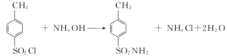 1.由對磺酰氯與氨水反應而得。工藝流程:先向胺化鍋中放入適量的冰水,再將按質量配比(對磺酰氯:純氨=1:0.2)計量好的對磺酰氯和氨水依次放入鍋中,開動攪拌器,利用胺化鍋夾套的冷液控制鍋內溫度至70℃左右(該反應大量放熱),然后降溫至30℃左右出料。胺化物放入過濾桶過濾,并用溫水洗滌,吸干則得固體粉狀粗品對磺酰胺。粗品對磺酰胺含有少量的鄰位體信副產品油狀有色物質。利用對位胺易溶于氫氧化鈉液的性質及用活性炭脫色,可達到提純精制目的。物料質量配比為粗對位胺:30%氫氧化鈉液堿:水=100:45:1300;粗對位胺:活性炭=100:(2.5-3.5)。按此配方量將水和燒堿放入提純鍋中,打開夾套蒸汽閥加熱至70℃,再加入配方量的粗對位胺,開動后攪拌器,待粗對位胺全部溶解時,分次加入配方量的活性炭,繼續攪拌0.5h,將料液放入過濾桶,趨熱過濾,用熱水洗滌,吸干。濾液隨即打入精制鍋,用鹽酸中和至ph值=2-3,降溫至30-35℃左右,將料液放入過濾桶過濾,再用水洗至中性,移入離心機離干,即為含水10%的成品,若需要干品,則送到氣流烘干器烘干,得含水1%的對磺酰胺成品。2. 將對磺酰氯與純氨依次加入冰水中,控制對磺酰氯與純氨的質量配比為1∶ 0.2,攪拌下進行反應,冷卻并控制溫度為70℃。反應結束后,經冷卻、過濾、洗滌得粗品,粗品經堿洗、脫色、水洗、中和、過濾、水洗、干燥即得成品。