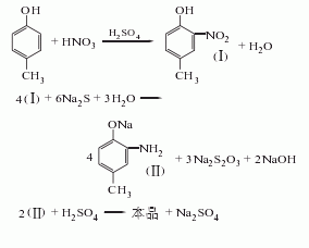 1.以對(duì)酚為原料,以硝酸、配制一定濃度的混酸進(jìn)行硝化,反應(yīng)畢,分離廢酸,經(jīng)洗滌蒸餾后以硫化堿還原,后經(jīng)酸析、結(jié)晶、干燥得成品。
